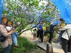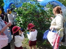 先生も食べてみました。甘いものや、ちょっと酸っぱいもの、どれも自然の味がしてとっても美味しかったです。残っていたサクランボは、ネットで守っていたのですが、連休中に鳥が全部食べてしまったようです。