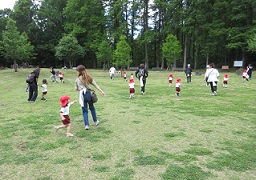 3歳児は親子で行きました。紫陽花を見た後は、芝生の上で遊びました。親子で体を動かして遊んだりみんなでダンスをしたりしました。おうちの人とふれあって遊び、子どもたちはとても幸せそうでした。