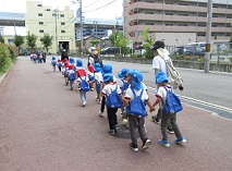 前回は4,5歳児だけでしたが、今日は3歳児も一緒に、瓜破西小学校へ遊びに行きました。5歳児のお兄さんお姉さんがが手をつなぎ、3歳児を連れて行ってくれました。3歳児も最後まで自分の足でしっかりと最後まで歩けましたよ。
