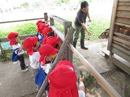 小学校にはヤギやウサギがいて、エサをあげたりなでたりして仲良くなったり、広い芝生を思い切り走ったり、遊具で遊んだりしました。池にはエビやメダカの赤ちゃんがたくさんいました。シロツメグサもたくさん咲いていて、お花を摘んだり、チョウを追いかけたり・・・とても楽しい時間を過ごしました。