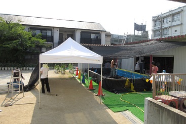 日よけをつけました! 公開日 2024/06/14 更新日 2024/06/14 幼稚園の様子 先日、大きなプールがお庭にできました。今日は、先生たちがテントを立てたり梯子に上ったりして、日よけを取り付けました。 準備は着々と進んでいます。プール遊びが始まるまでもう少し。楽しみに待っていてね! いいね(0)