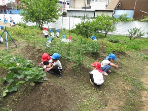 子どもたちもその後を続いて大活躍!美味しい野菜を育てるにはお世話が必要なことを知らせ、それぞれのクラスで畑に向かいました。