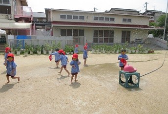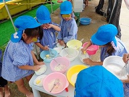 プールで思い切り遊ぶことも楽しいですが、水に触れる中で、自分なりに考えたり工夫したり、自分で遊びを選択して遊ぶ経験もできるようにしたいと考え、今年はいろいろな水遊びを楽しむ『水遊びデー』をつくりました。