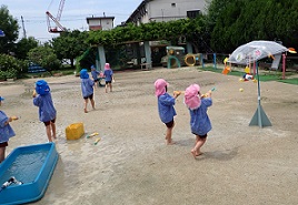 宝探しやスーパーボールすくいをしたり、水鉄砲で遊んだり、泡遊びをしたりと、自分で自分のしたい遊びを選択し、全身びしょぬれになりながら、思い切り水遊びを楽しみました。
