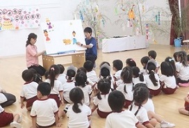 今日は7月生まれのお友達の誕生会をしました。今年の七夕は日曜日なので、誕生会の後で、お供えについて知らせたり、パネルシアターで織姫と彦星のお話をしたりしました。