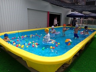 24日はプール開放最終日でした。浮き輪を持ち合って電車ごっこをしたり、ボールや水鉄砲などの好きなおもちゃで遊んだり・・・好きな遊びも存分に楽しみました。とても気持ちがよかったね!