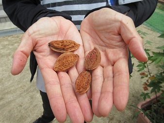 3月に桜のような花が咲く様子を、ここでご紹介しました。2枚目の写真、左下の〇のように、梅を細長く大きくしたようなきれいな実ができ、右上の〇ように、それが弾けると中から先生の手の上にある実が落ちてくるのです。いつも食べているアーモンドのイメージからは随分違うので、初めて見た時には先生もびっくりしました。