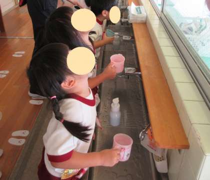 子どもたちは上手に上を向いてガラガラうがいをしていました。