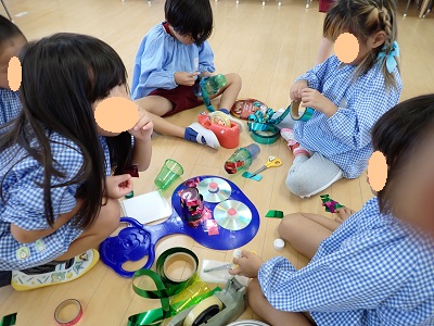 グループに分かれてどんなかかしにするのか話し合い、色々な素材を組み合わせて4体のかかしができました。「僕たちのかかしは鳥が嫌いなキラキラをいっぱいつけたよ」「私たちのかかしはめっちゃ怖い顔にしたよ」と子ども達の思いが込められたかかしが完成しました。それを田んぼの4隅にくくりつけて「これでばっちり」「鳥がこないといいね」と子ども達は安心して今日は降園していきました。