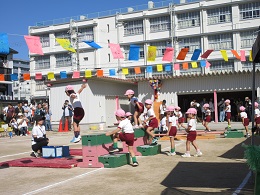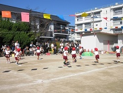 5歳児は縄跳びや一本歯下駄、鉄棒、パラバルーンの選手になり、これまで頑張ってきた技を披露しました。リレーでは仲間と力を合わせ、勝っても負けても最後まで走り切る姿はとてもかっこよかったです。