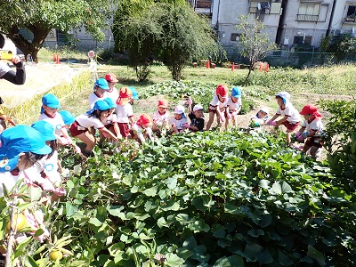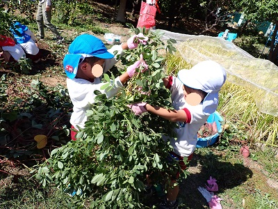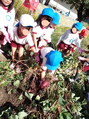 サツマイモは「葉っぱがハートの形みたい」「つるで綱引きできそう!」と葉っぱやツルにも興味をもって「うんとこしょ!どっこいしょ」とひっぱっていました。大きなお芋がたくさん掘れて「先生見て!こんな大きなお芋がほれた」と大興奮でした。落花生を初めて見る子ども達もいて「すごい!いっぱいついてる」「落花生ってこうやってできるんや」と根っこにたくさん実ってる落花生を不思議そうに見ていました。カボチャも9月ごろからどんどん実り今日もたくさん収穫できました。まだまだ日中は暑い日が続きますが、秋の実りの大収穫で、季節はやっぱり秋だなと感じた一日でした♪