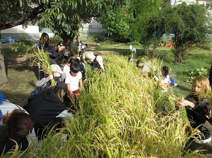 稲刈りの様子を見ていると「お米ができているね」「早く食べたい」「下のほうを切るんだよ」と親子でなかなかできない体験を楽しそうにしていました。これから干して、脱穀してみんながいつも食べているお米にしていきます☆楽しみですね♪