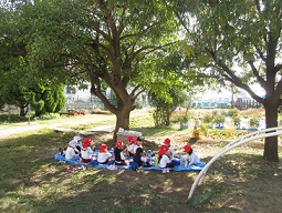 昨日はとってもいい天気。3歳児あか組は、ビオランドにピクニックに行きました。木陰に大きなシートを広げ、みんなで一緒にお弁当を食べました。ぽかぽかと温かい日差しの下、子どもたちの可愛い笑い声が響いていました。