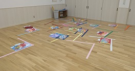 子どもたちの絵の額を決めているのです。額の色ひとつで、絵がパッと明るく見えたり、絵の具の色が引き立ったりします。個人の立体作品の下に敷く布も同じくですが、どの色だと一番作品が映えるのか、いろいろな色を試しながら、子どもたちの頑張った作品をより素敵に飾れるよう時間をかけて決めていきます。