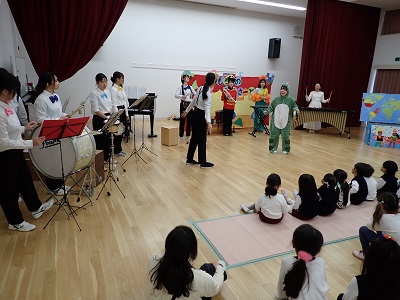 大阪教育大学の学生さんがとっても素敵な音楽コンサートをしてくれました。さすが先生を目指している皆さん。子ども達が楽しく興味をもって聞いたり見たりできるように工夫されていて、子ども達もすごく引き付けられていました。コンサートが終わった後も「楽しかったねー」「もう一回みたい」と目をキラキラ輝かせながら話をしていて、とても有意義のある時間を過ごすことができました。私達教師もすごく刺激になりました。