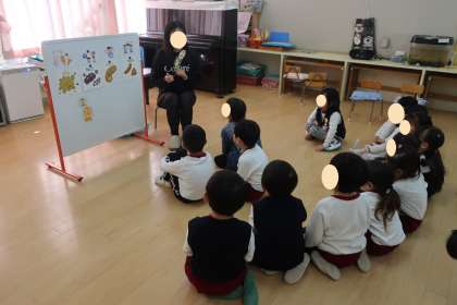 4歳児もも組では「いろいろなうんち」について保健指導を行いました。うんちは健康状態によって、水みたいな「うんぴ」、柔らかくてひょろっとした「うんにょ」、バナナのような形の「うんち」、カチカチな「うんご」など、色やにおい、形が変わることを伝えました。
