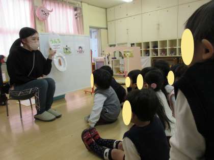 3歳児あか組では、「バナナうんちを出すには」について保健指導をしました。