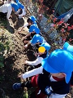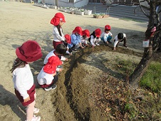 本園にはサクランボ、栗、柿、ミカンなど、四季折々の実のなる木がたくさんあります。その木が、冬の間に、栄養を蓄え、また新しい実をつけることができるよう、子どもたちと『寒肥』をしました。