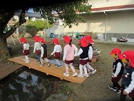 各クラスごとにビオランドの変化を見に行きました。大きなブドウ棚やトレリスにはビックリ!!ブドウを植えることにも期待をもっていました。橋が新しくなっていることにも気付き「先生、歩いてもいい?」と早速渡っていました。山には芝を植えたので、春には緑色の山になる予定です。