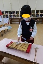 先日のビオランドお祝いの会で、マリンバコンサートを見た子どもたち。小さな木琴や大きな木琴を鳴らし、マリンバごっこを楽しんでいます。演奏者の方が4本のマレットを持って演奏していたのを思い出して挑戦!うまく演奏できたかな?マリンバ演者になりきって遊んでいる姿がとても可愛いです♪