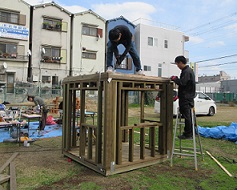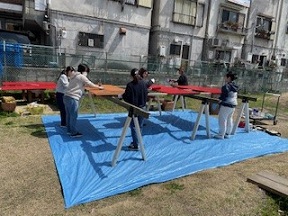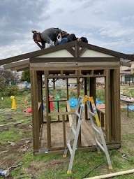 今日もおうちづくりのため、工務部の皆さんが幼稚園に集まってくださっています。今日からもう1名のお父さんが加わってくださり、作業はどんどん進んでいます!今日はおうちに屋根がつきました。たった2日でここまで!本当にびっくりです。お母さんたちも、ペンキ塗りを頑張ってくれました。