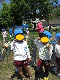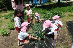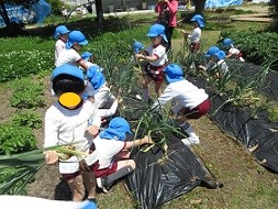 昨年度に植えたタマネギが育ちました。「葉が倒れてくるのが、土の中で大きくなった合図なんだよ」と5歳児に知らせると、毎日のように「少し折れてきた」「あと少しで大きくなるかな」と楽しみにしていました。