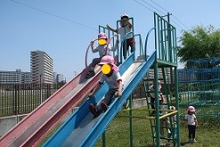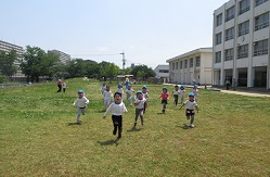 前回は5歳児だけでしたが、今回は4歳児も一緒に行きました。5歳児は前回来た時と変わったところをみんなで見つけ合いました。「シロツメグサが増えている!」「幼稚園と同じ花が咲いてる!」といろいろな発見がありました。4歳児は、散策をした後は、小学校の遊具に大はしゃぎ。大きな滑り台にも挑戦しました。そして、みんなで広い芝生を思い切り走りました。