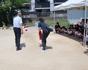先生たちが消火器を使って消火する訓練をし、その様子もみんなで見ました。