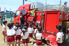 避難訓練の後には、消防車を見たり消防服を着たり運転席に座ったり、知りたいことを質問して答えてもらったりと、特別な体験をさせていただきました。