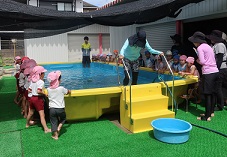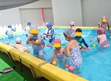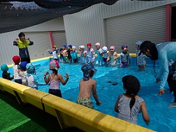 その後、プールに入りました。初めてのプールにみんな大喜びでした。これからいっぱい、プール遊びを楽しみましょうね!