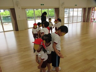 明日に備え、手をつなぐペアを決め、ふれあい遊びをして仲良くなりました。そして、一緒に幼稚園の園庭を散歩しながら、歩き方を知らせました。また、信号などの交通ルールや、明日は途中で歩道橋があるため、階段を上ったり下りたりするときの約束も知らせました。