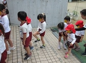 明日は、みんなでお散歩に行く予定です。3歳児あかぐみは、初めて園外に出かけます。そこで、明日は、幼稚園で一番大きい、あおぐみのお兄さんお姉さんと手をつないで行くことにしました。