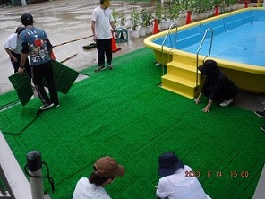プール遊びの日が近づいてきました。今日は、午後からプールを組み立てました。とっても大きなプールですが、PTAの方も手伝ってくださり、力を合わせて組み立てることができました!