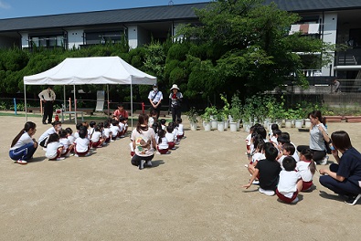 16日(金)に火災の避難訓練をしました。この日は、消防士さんが園に来て、避難訓練の様子を見てくださいました。園庭では、消防士さんのお話を、みんな真剣に聞いていました。そして、お話の中で、避難の時の大切な約束『おはしも』を教えてもらいました。「お」押さない「は」走らない「し」喋らない「も」戻らない です。保護者の皆様も覚えておいてくださいね。