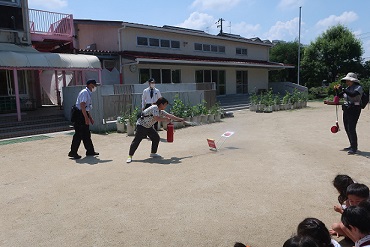 その後、先生たちが消火器を使った消火訓練をする様子も見ました。先生たちも、子どもたちの命を守るため、一生懸命頑張りました。
