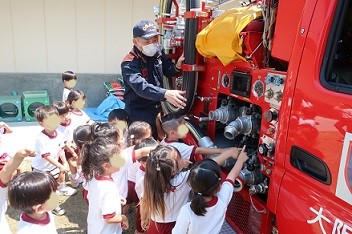 訓練後には、消防車を見せてもらい、気になったことを消防士さんに質問し、色々なことを教えていただきました。消防士さんの服も着せてもらい、みんな大喜びでした。