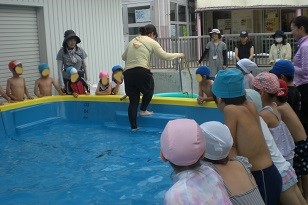 その後に5歳児がプールに入りました。少しずつ体に水をかけたり、先生の話を聞き、楽しく遊んだりするところを、お手本になり、3歳児、4歳児に見せてくれました。