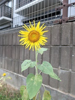 5歳児が種から育て、元気に咲いていたヒマワリは、とうとう、最後の一輪になりました。そして、花壇には今、キバナコスモスが咲いています。可愛いですね。