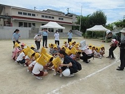 揺れが収まるまで、頭や体を守りながら待機した後、園庭に一時避難しました。どのクラスも落ち着いて行動することができました。
