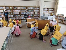 本園では、津波が起こった時には、瓜破北小学校の3階まで避難することになっています。小学校にもご協力いただき、本日はそこまで避難をしました。2枚目の写真は3階図書室で先生の話を聞いている様子です。みんな真剣に取り組むことができました。