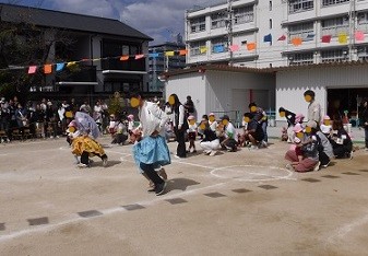 5歳児あおぐみは、スポーツ選手になって、自分で選んだ運動遊具に挑戦したり、リレーで力いっぱい走ったりしました。鳴子を持って踊る姿は力強く、みんなの息がピッタリ合っていて、本当にかっこよかったです!自分なりの力を発揮したり、仲間と力を合わせて頑張ったりする姿は、さすが年長児。感動し涙を流されるお客さんもたくさんいました。友達の姿に、一生懸命声援をおくる姿もとっても素敵でした!