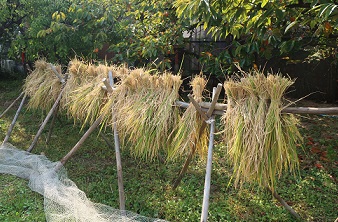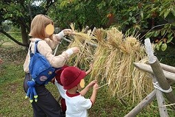 子どもたちが田植えをして育てた稲が、大きくなりました。そこで、親子で稲刈りを体験しました。切った稲は、縛ってまとめ、しばらく天日干しをします。お米の中には水分が含まれているので、こうやって干すことで水分量が減り、長期保存ができるようになります。また、稲からお米に栄養が移り、美味しくなるそうですよ。楽しみですね!