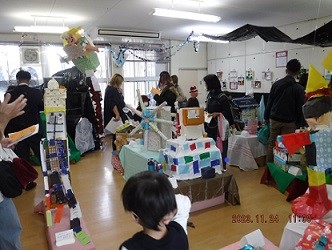 作品展で、子どもたちの思いを込めてつくった作品を、おうちの方に見ていただきました。子どもたちは自慢げに「これはね・・」と説明をしたり、おうちの方に褒めてもらって嬉しそうにしたりし、それぞれに作品展を楽しんでいました。おうちの方は、一つ年齢が上がるとぐっと様子が変わる保育室を見ながら「来年はこんな作品がうちの子にもつくれるようになるんだな」と期待をもちながら、色々なクラスの雰囲気を楽しんでおられました。