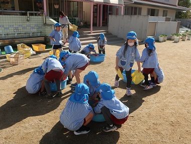 先日、幼稚園でも大掃除に取り組みました。「1年間使ったものをきれいにし、新しい年を気持ちよく迎える準備なんだよ」と子どもたちに知らせました。3歳児は「ありがとう」と言いながら、雑巾で棚などを拭いていました。4歳児は、スケーターやフープなどきれいにし、5歳児は砂場の遊具洗いを頑張りました。みんな、友達と力を合わせて一生懸命取り組んでいました。