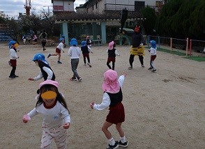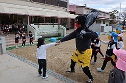 そうやって楽しんでいると・・・本当の鬼がやってきました!子どもたちは大興奮!鬼が担任の先生の手をつかんだため、先生を守ろうと必死に豆を撒きました。しかし鬼は子どもたちと仲良くなりたくて来たんですって。最後は握手をして鬼さんとも仲良くなりました。