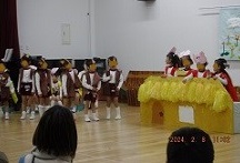 あかぐみは初めての発表会。初めての経験、たくさんの人に、きっとドキドキしたことでしょう。しかし、みんな最後までよく頑張りました!可愛いネズミになってのお芋掘り、子どもたちの大好きな遊びです。普段遊んでいる姿が垣間見える発表会になりました。