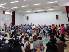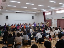 コンサートの始めに、「じっと座っていなきゃなんて思わなくて大丈夫。体を動かしていっぱい楽しんでね」とお話がありました。子どもたちの大好きな曲をたっぷり演奏してくださったので、子どもたちも保護者の方も、体を揺らしたり手拍子をしたりして、自由に音楽を楽しみました。『ジャンボリミッキー』では子どもたちもダンスに参加しました。みんなとてもかわいかったですよ!迫力のある素敵な演奏を身近で聴くことができ、皆さんとても喜んでおられました。