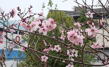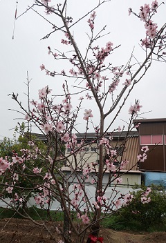 オナモミがたくさんできたあたりに、今とてもきれいな花を咲かせている木があります。桜にも似ていますが、花は桜よりも大きいです。食べると美味しい実ができます。大人にも人気の食べ物です。