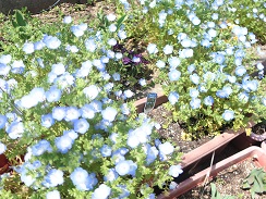 桜の下の花壇には、ネモフィラがたくさん咲いています。爽やかなブルーでとてもかわいい花ですね。