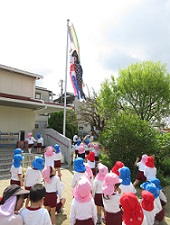 幼稚園のこいのぼりは、とっても大きいです。16日に初めてあげたのですが、その大きさにも高さにも子どもたちは大喜び。こいのぼりが風に吹かれて泳ぐと、拍手が起こりました。